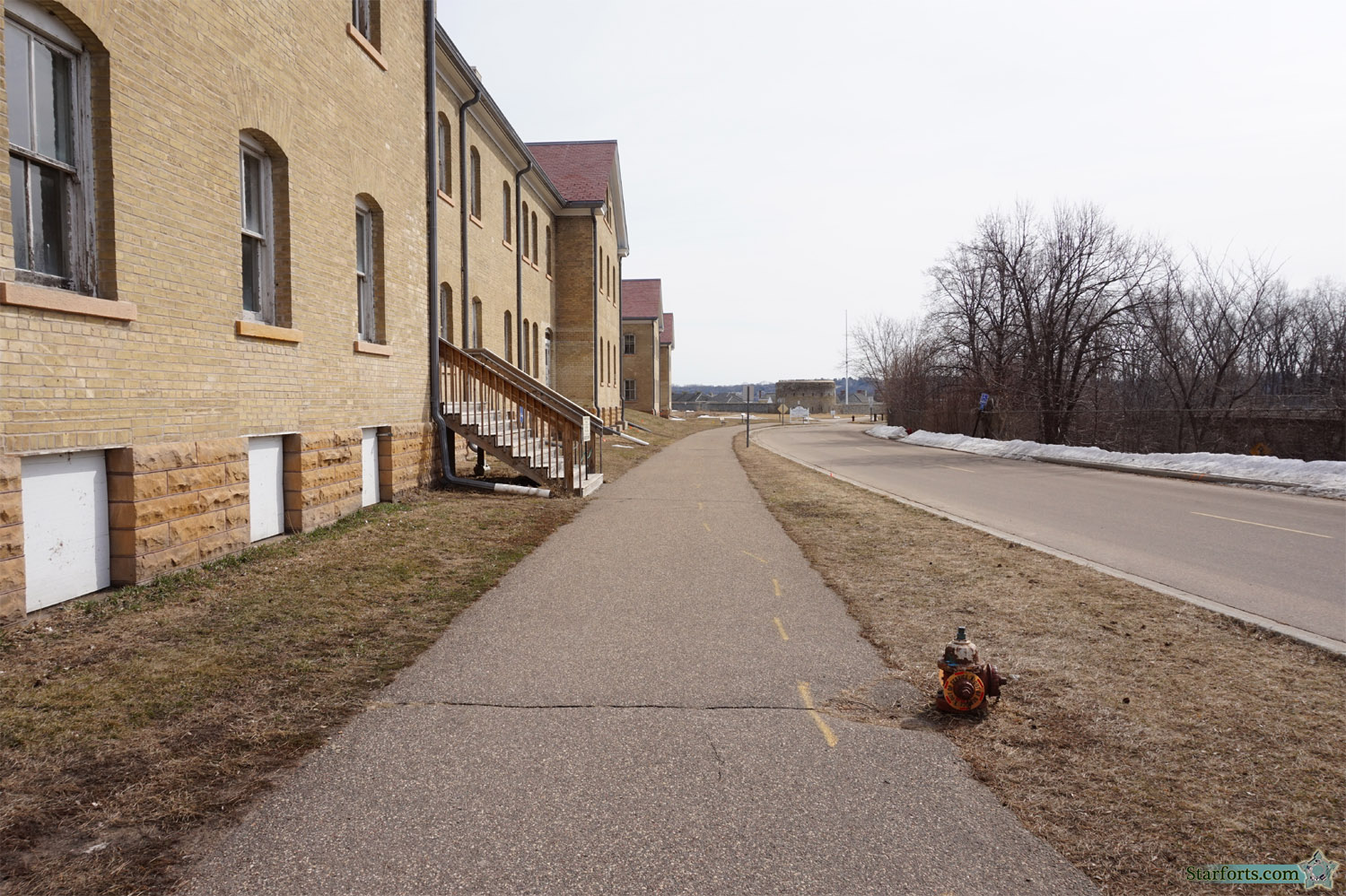 A brief stroll reveals a pair of majestic structures built by the US Army in 1905, which were whimsically named Buildings 17 and 18. They were initially built to house cavalry troops, and were used as barracks for non-cavalry troops through the Second World War. The nearby informational sign, US Army, Buildings 17 and 18, tells the story. And what is that we see, further down the road?