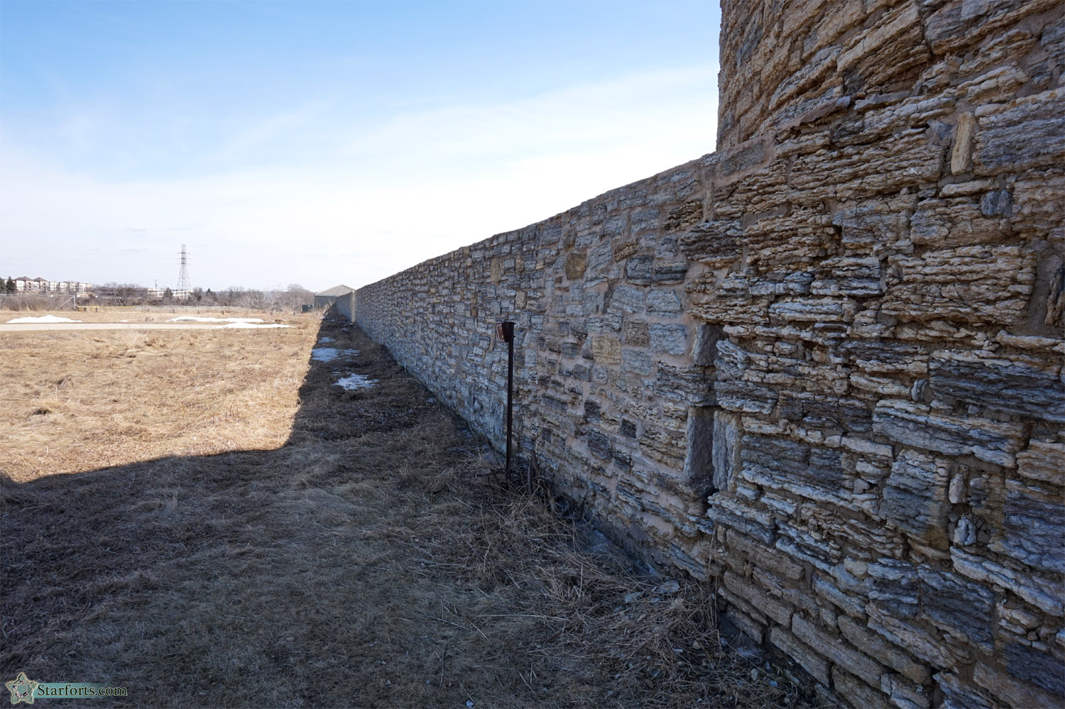 But we have one last side of Fort Snelling to investigate: The northwest wall, which ends at the North Battery. We're nestled against the Round Tower on the right.