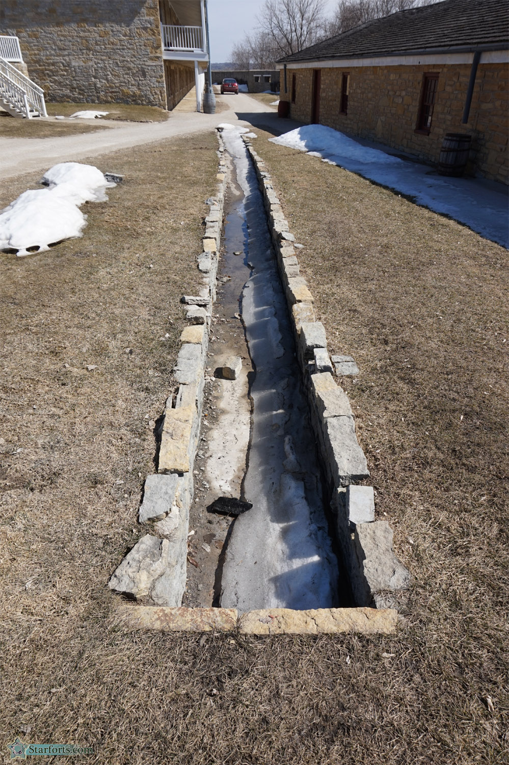 Once again, appreciating the symmetry and plain ole wicked coolness of this ditch. There it is with ice in it, so clearly it's well-sited. Was this such a carefully-delineanted ditch when Fort Snelling was an operational military post? Difficult to say, and also difficult to say why this ditch is so important to me. Moving on.