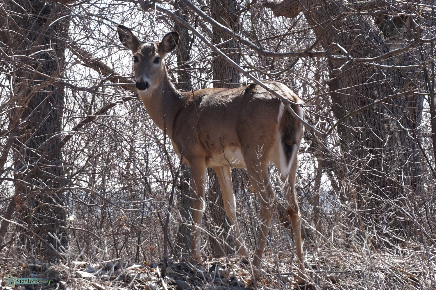 A brief trail leads south from the chapel to the busy Highway 55, concluding at the western extent of the Fort Snelling-Mendota Bridge, completed in 1926 and today crumbling away in a genial fashion. Though surrounded by airport, highways and general urban action, this small verdant area manages to support at least one starfort deer...which was not impressed by me, and here regards me with the cool, casual wariness that only a starfort deer can pull off.