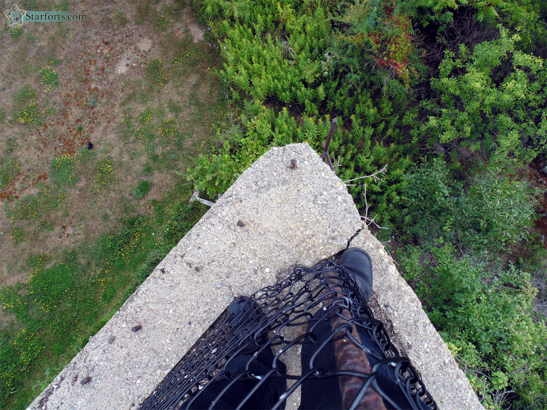 We have now meandered our way over to the tip of the troubled northeast bastion: This is the one made of concrete, awaiting not only a stone façade, but also a stone lip that serves as firing crenellations and a bit of a safety railing for idiots who get too close to the edge. As it is my firm policy to get a pic of my feet at the tip of every bastion with which I come in contact, this was the best I could do with the non-period fencing along that bastion's edge.