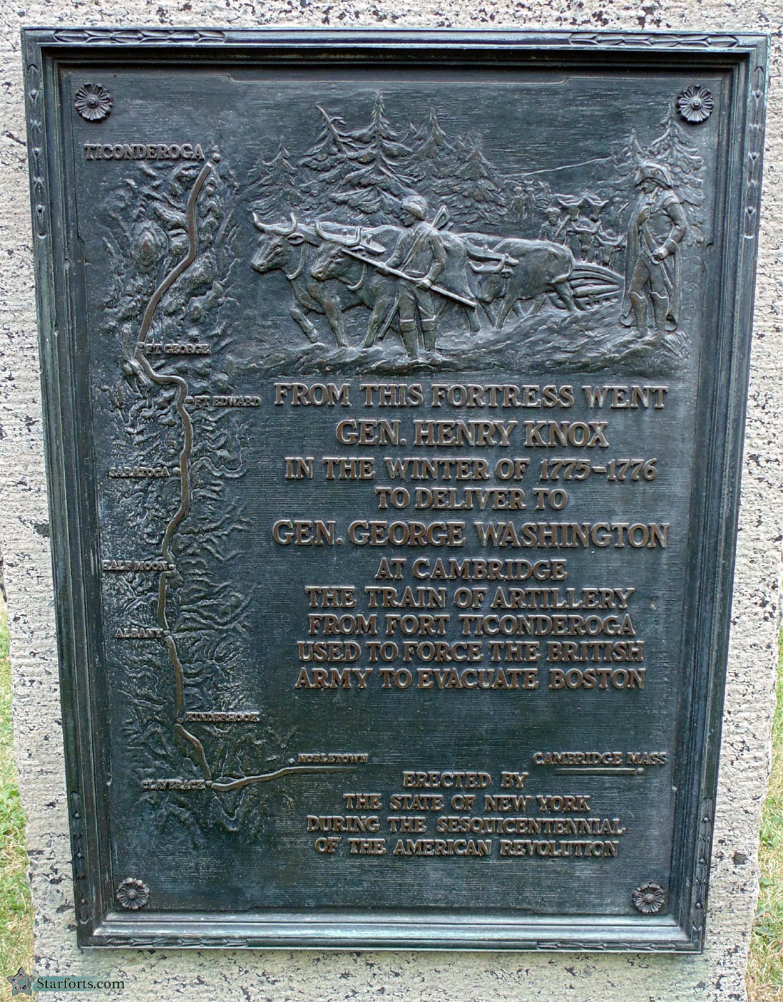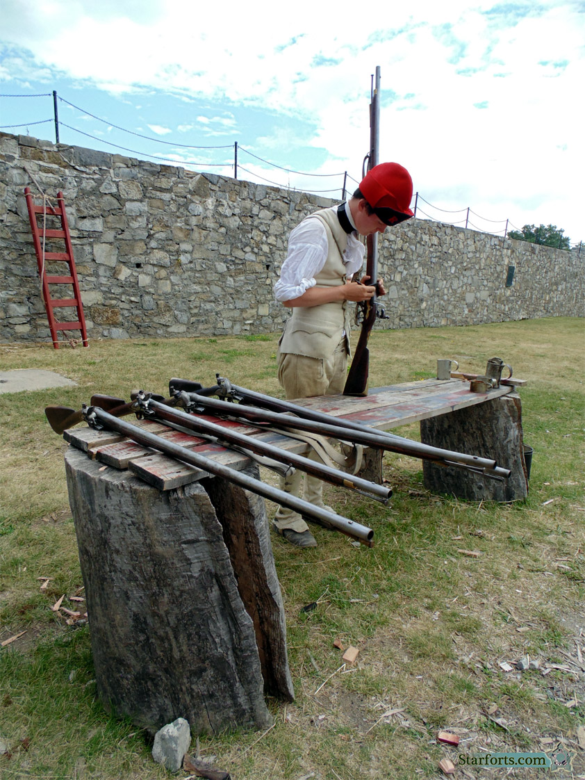 Back on the parade ground, a young armorer works with some Brown Besses! Hey look, there's a plaque on the wall in the distance: Click here to see it: Beware, it's about Montcalm, and it's in French! Don't hurt yourself trying to pronounce those words! Also, on a freestanding stone in front of that Montcalm plaque is one about Henry Knox, namesake of Maine's spectacular Fort Knox, and the heroic thing he did involving artillery and Boston: Click here to see. |
