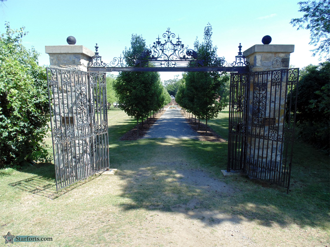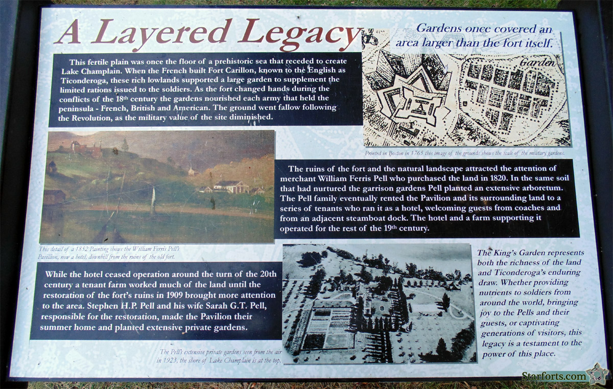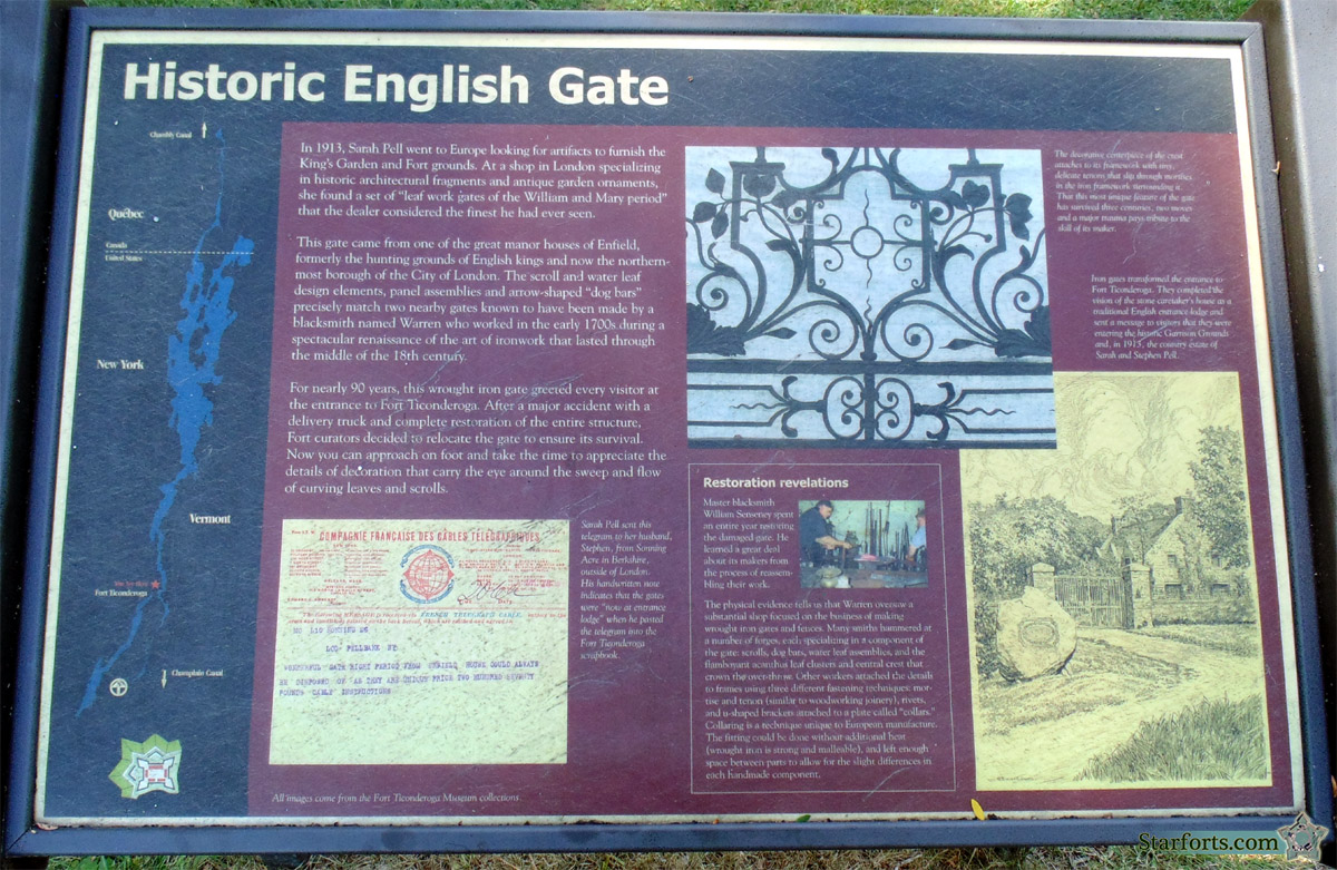 Just a brief stroll to the northeast of Fort Ticonderoga is the King's Garden. This is part of Stephen and Sarah Pell's legacy, a ridiculously beautiful arboretum placed seemingly at random, next to an historic starfort. This gate was made in the early 18th century in England, and was purchased by Sarah Pell in the early 20th century to serve as the gate at the "entrance lodge" of Fort Ticonderoga, where it was installed in 1913. A run-in with a delivery truck in the early 21st century and subsequent restoration of this gate prompted those in charge of such things to move it to its present location, at the entrance of the King's Garden. Next to this gate is a sign about the gardens, called A Layered Legacy: Click here to see it. There is also a plaque about the gate itself: Click here to see Historic English Gate. |