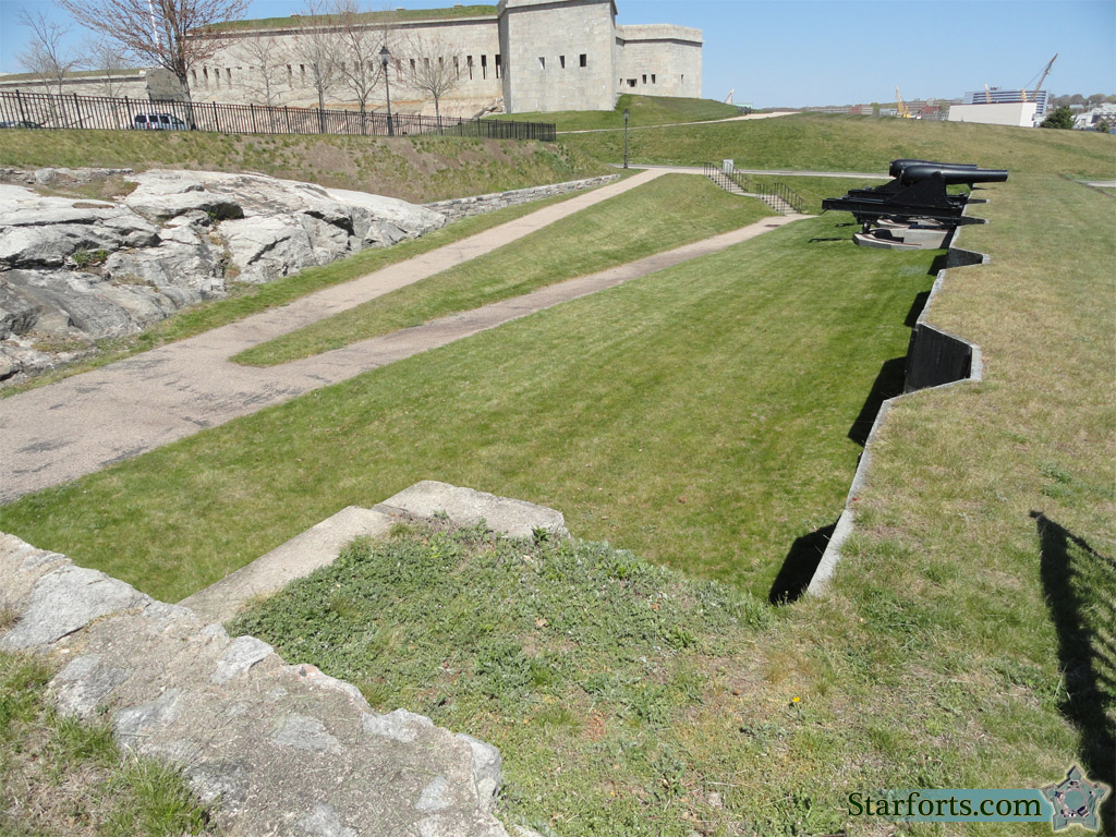 The South Battery. Built in 1840 at the same time as the rest of the fort, by 1879 it mounted six Rodman guns and two Parrot guns, plus four smaller guns dangling out in front of the battery's protective parapet. In 1892 seven mortars were added behind this battery, in what is today Fort Trumbull State Park's parking lot.
