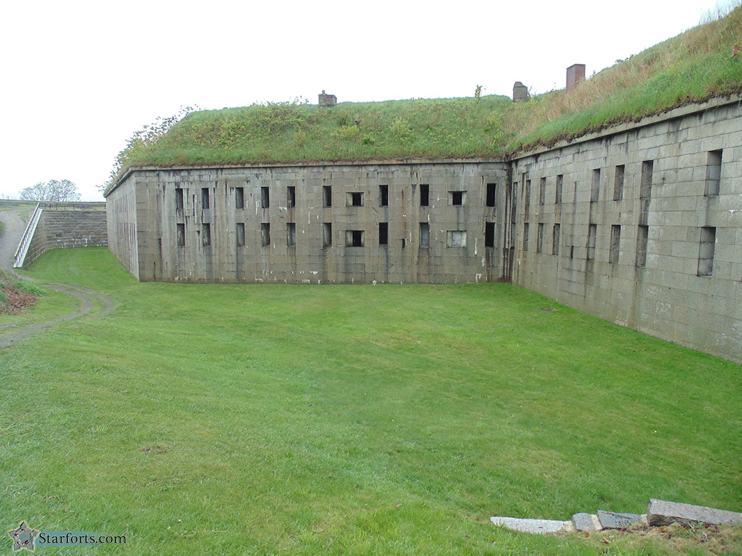 Looking to the left from the bridge that leads into Fort Warren, at the busy curtain wall and northern bastion.