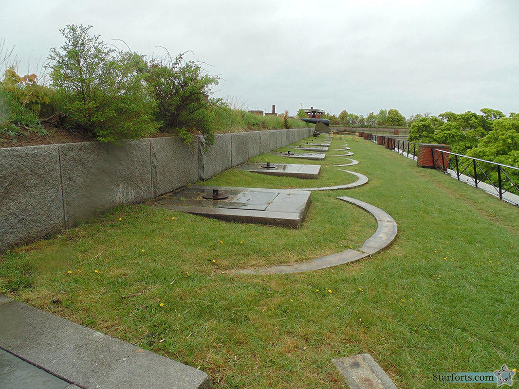 Pintles for guns that never were. I count upwards of 120 gun pintles along Fort Warren's terreplein and outer battery from satellite imagery, and there were likely plenty more covered up by the Endicott Era batteries built along the fort's eastern wall. One imagines the US Army going to congress upon the completion of the fort in 1858, asking for the 200 or so vastly expensive guns originally envisioned as Fort Warren's armament, which were already technologically inferior to any guns an attacking navy might utilize. Dudes needed to either build starforts faster, or develop artillery slower.