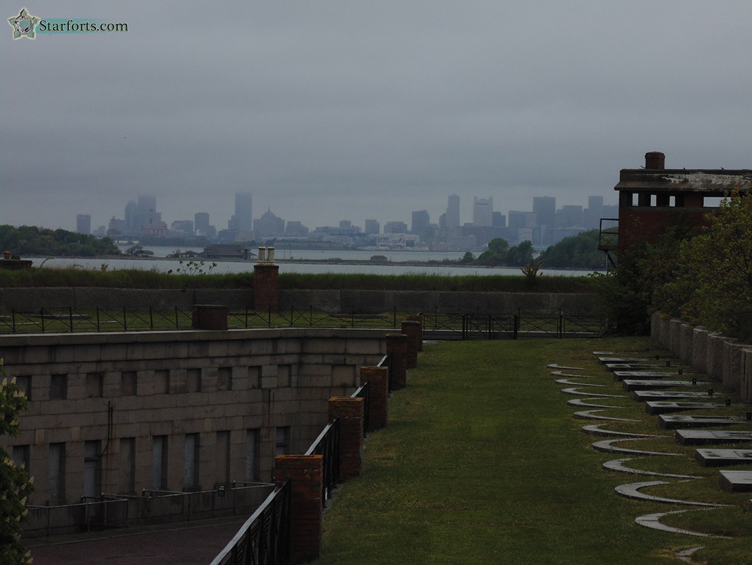 Hey, there's a city over there! Looking back over Fort Warren's northern wall and bastion, we see that Boston has magically appeared out of the mist! When it had been raining just minutes previously, we felt alone in this big fort on this little island.