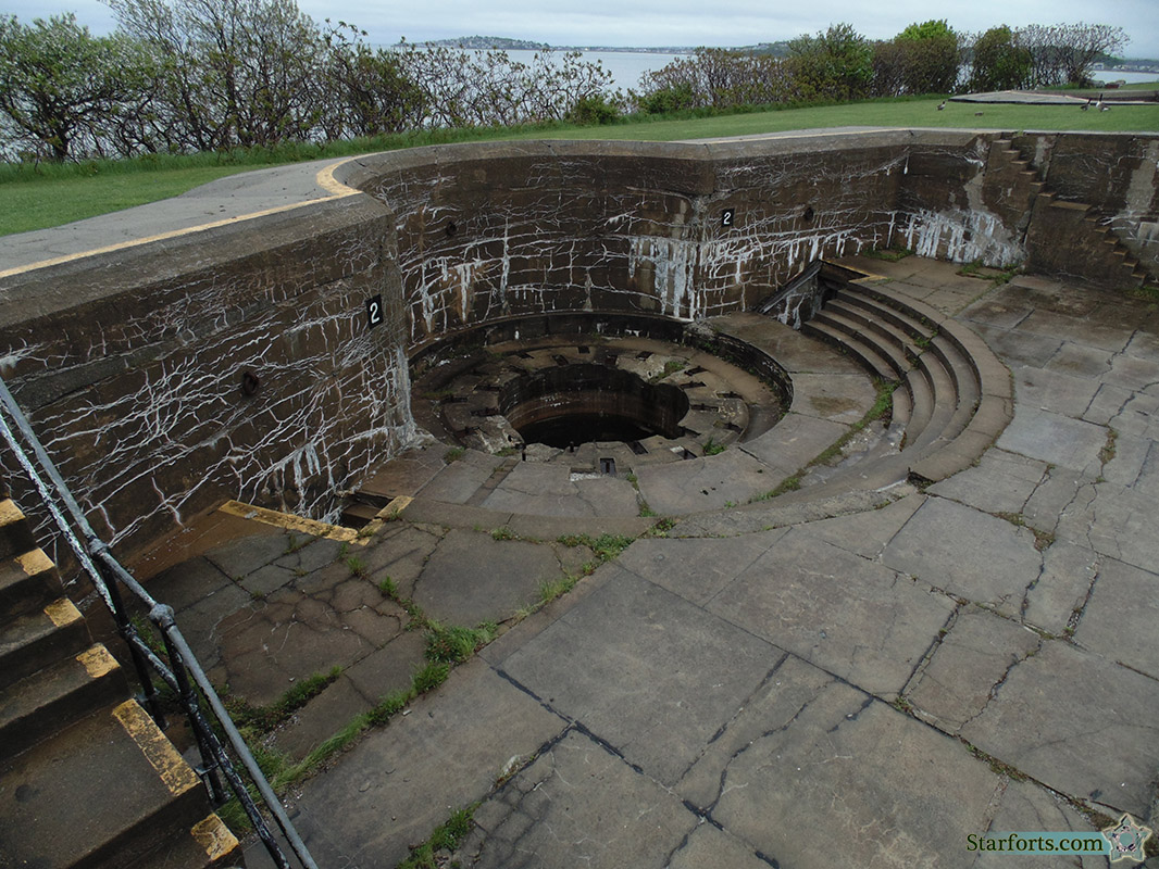 The mount (pit) for the M1888 10" Disappearing Gun of Battery Adams. Named for Captain John G. B. Adams, who was seriously wounded at the Battle of Gettysburg (July 1-3, 1863) where he also won a Medal of Honor for distinguished gallantry in action, this was one of the first batteries built during the Endicott Period of American seacoast defense. It was unfortunately built with cheap concrete, which began to deteriorate almost as soon as it dried in 1899, and the battery was pronounced unusable and deactivated by 1914.