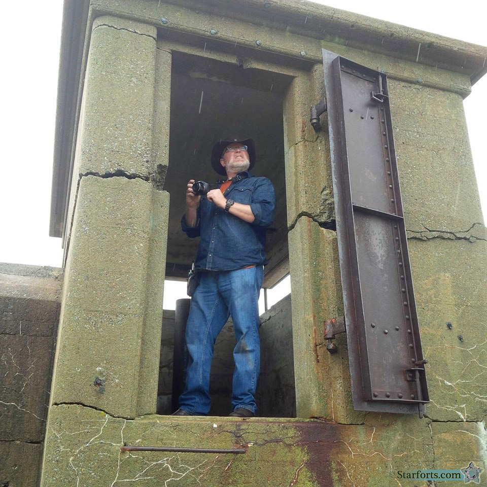 The author in the Battery Commander's Station (which appears to have taken a direct hit or two) betwixt Battery Stevenson's guns.