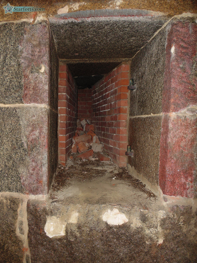 The enclosed Bastion A was originally divided into an indoor drill hall, a storage facility for wagons and gun carriages, and yet another powder magazine. Powder magazines in starforts require air circulation, which resulted in lots of weird little channels being built into the walls, with openings such as this one. There was obviously a door on this little opening (note the hinges on the right)...maybe air circulation was somehow managed in different situations?