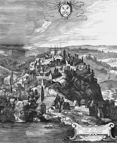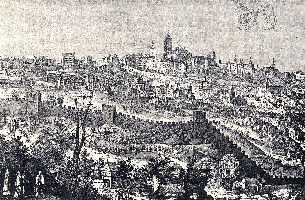 Vyšehrad at the beginning of the 17th century, At the top is The Chapter's coat of arms (coat o' keys). Their motto: Don't worry, God, WE'VE got the keys! |