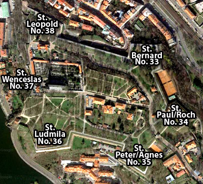 As was standard practice for devout, starfort-buildin' monarchies, Vyšehrad's bastions were named after saints: Weirdly, two of the bastions were named for two saints?! Well, if each saint is thought to provide protection in one particular area, then mixing & matching one's saints surely makes a super power? Vyšehrad's bastions were named St. Bernard; St. Paul/Roch; St. Peter/Agnes; St. Ludmila; St. Wenceslas; and St. Leopold. These perfectly serviceable names were later replaced by soulless numbers as part of the Prague Fortress System.