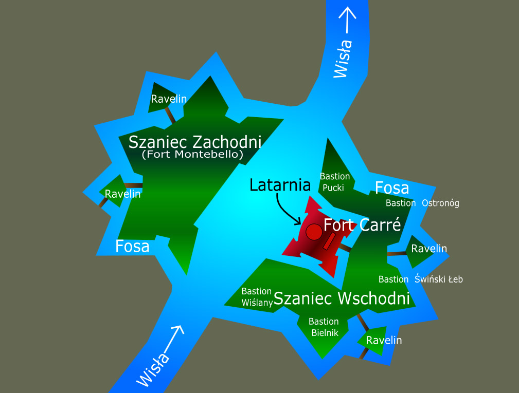 The plan for improvements to Twierdza Wisloujscie around 1660. The starfort part is here identified as "Fort Carré," which is not to be confused with Fort Carré in Antibes, France: This is merely a reference to the style of the fort itself. Carré in French means "square," which is essentially what this fort is, once you take away the corner bastions. Latarnia means lantern, a reference to the fort's lighthouse. |